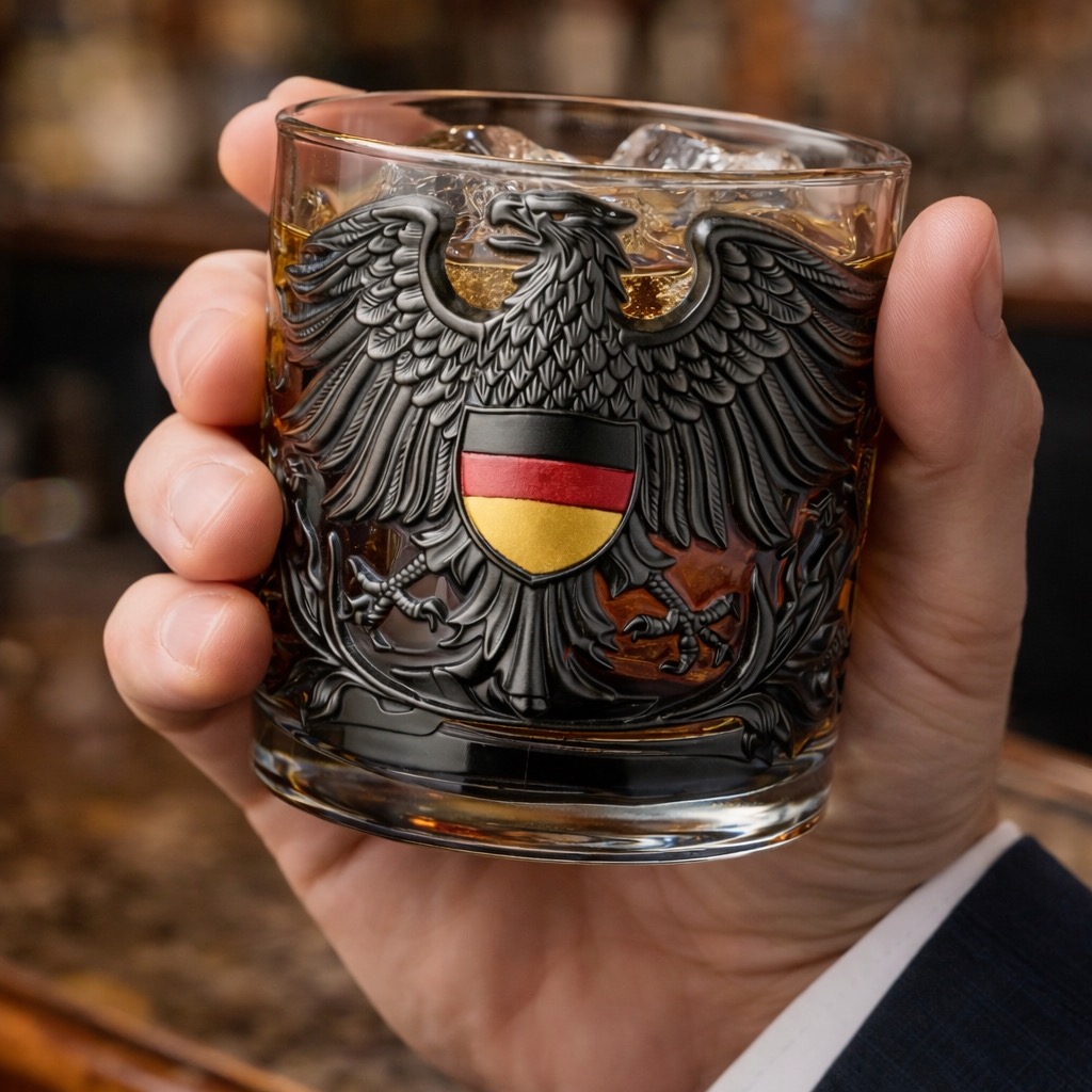 The DE Black Eagle Embossed Heritage Glass transforms this timeless emblem into a sculpted object of presence—designed to be held, admired, and collected.
